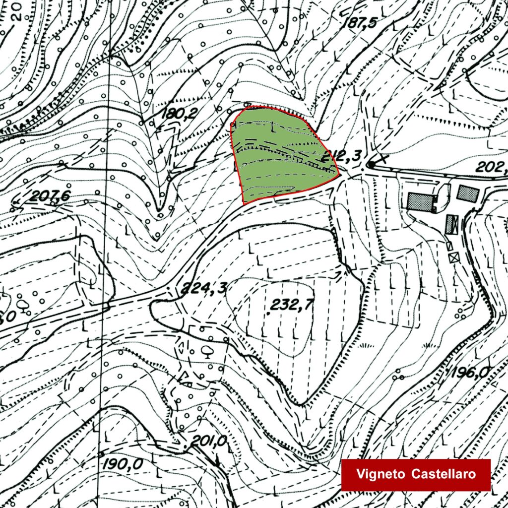 Castellaro, rivolto a nord, è anch’esso coltivato a Garganega. Qui domina la roccia, infatti, sin dai primi centimetri il terreno è costituito da pietra pura. Le radici devono farsi spazio tra le fenditure, e questa fatica si riflette in un vino teso, minerale, dal carattere deciso. Nel vigneto di Castellaro è stato individuato un suolo moderatamente profondo ma con un profilo ricco di scheletro.